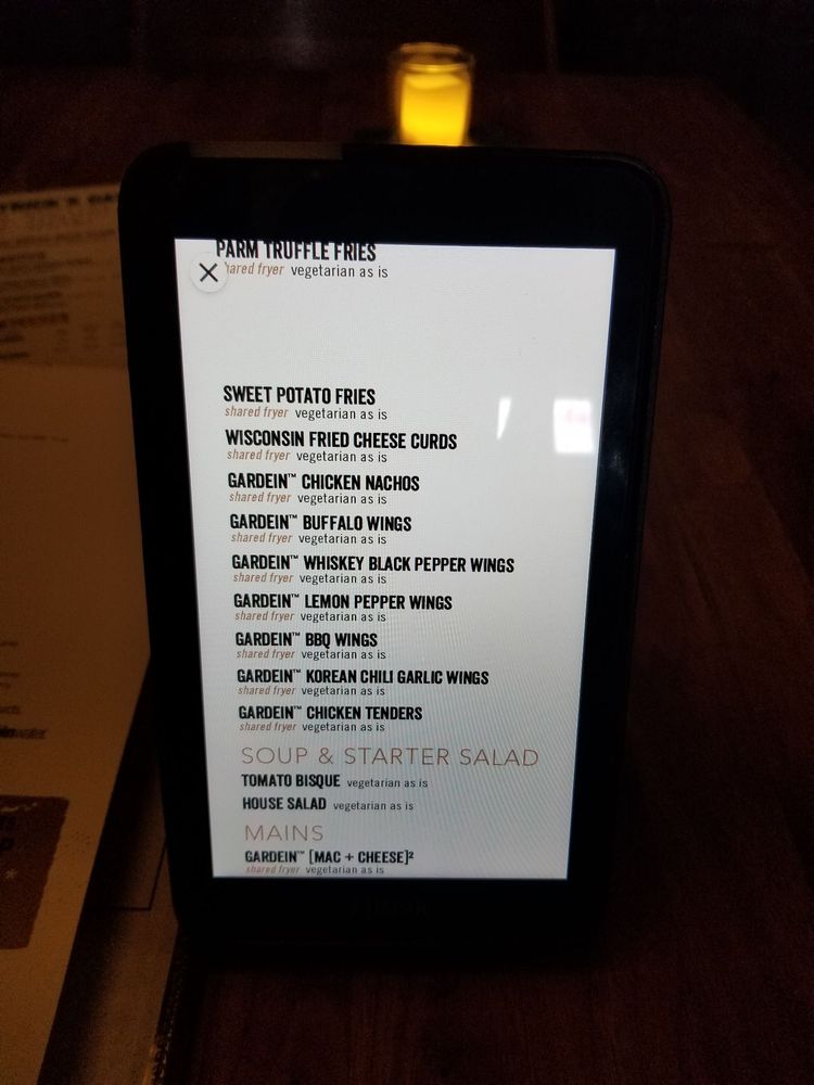 Sweet potato pancakes, pickles, ranch dressing, honey hot sauce. Gardein available.